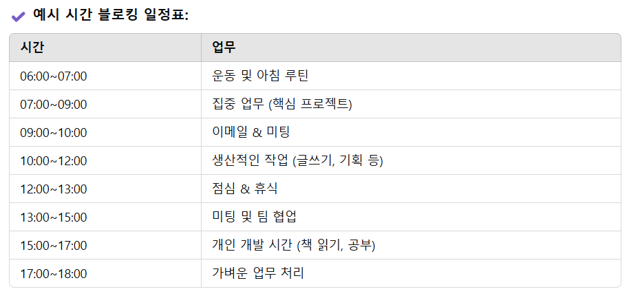 ✅ 시간 블로킹 기법을 도입하라 (우선순위 높은 일 먼저 배정)